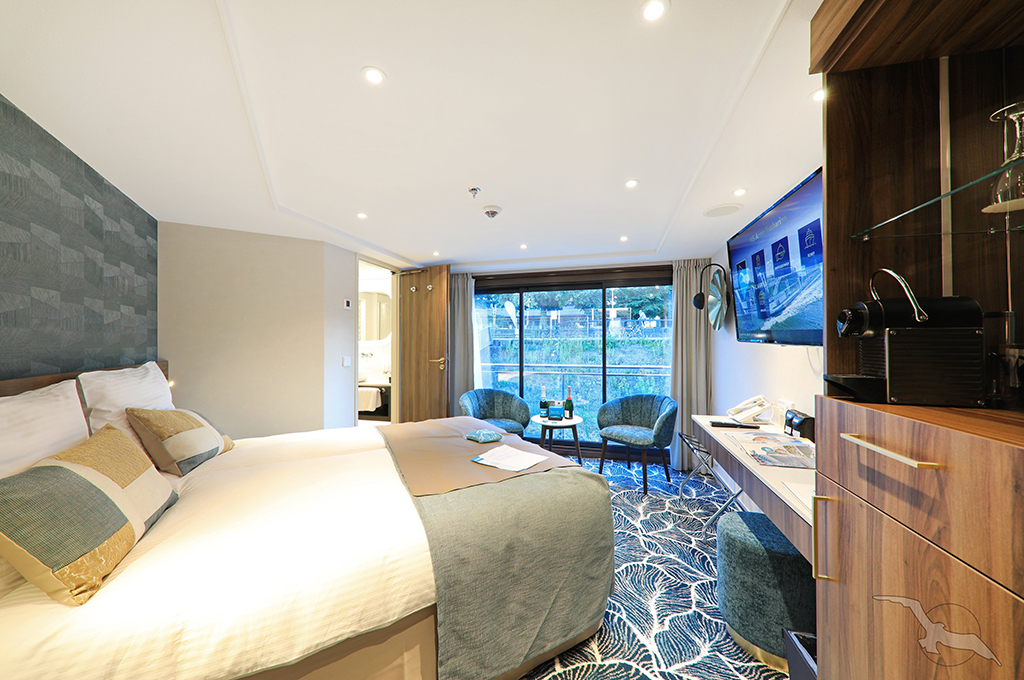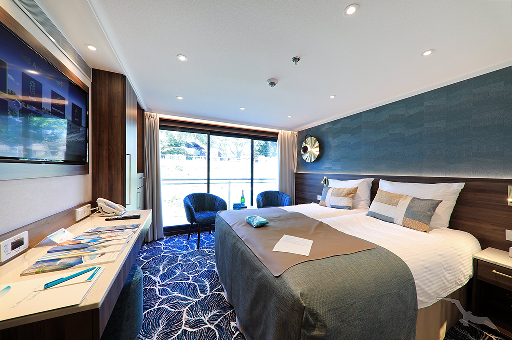 Elegantes Ambiente und moderner Komfort versprechen eine angenehme Reise. Genießen Sie ruhige Momente in Ihrer großzügigen Kabine. Gönnen Sie sich eine frische Tasse Kaffee am französischen Balkon oder lassen Sie sich im Panorama-Restaurant kulinarisch verwöhnen. Verbringen Sie zauberhafte Momente auf der Sonnenterrasse und lassen sich von der vorbeiziehenden Landschaft begeistern.